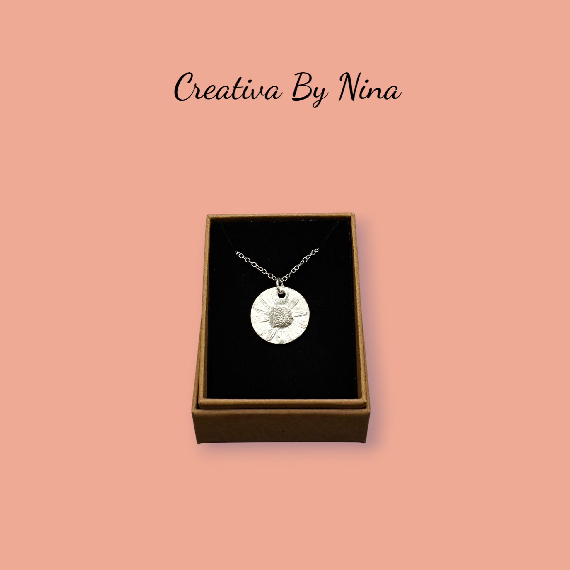 A lovely silver pendant featuring a ragwort flower, a delicate plant with yellow blossoms commonly found in the UK during the months of June to November. There are several types of ragwort, some of which are beneficial for wildlife and even used in herbal medicine.